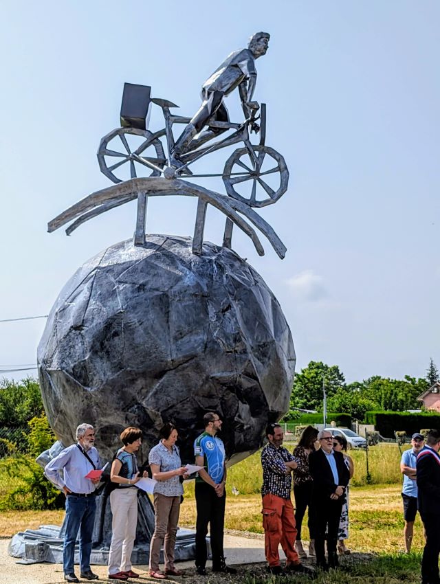 Le 8 juin 2024 à 11h, a eu lieu à Lavardac (Lot-et-Garonne) l’inauguration d’une statue de 8,40m de haut, représentant un homme, sur un vélo, sur des rails, sur un globe terrestre. A l’avant de ce vélo : une étoile verte entourée des mots “Tour du monde à bicyclette par Espéranto”.