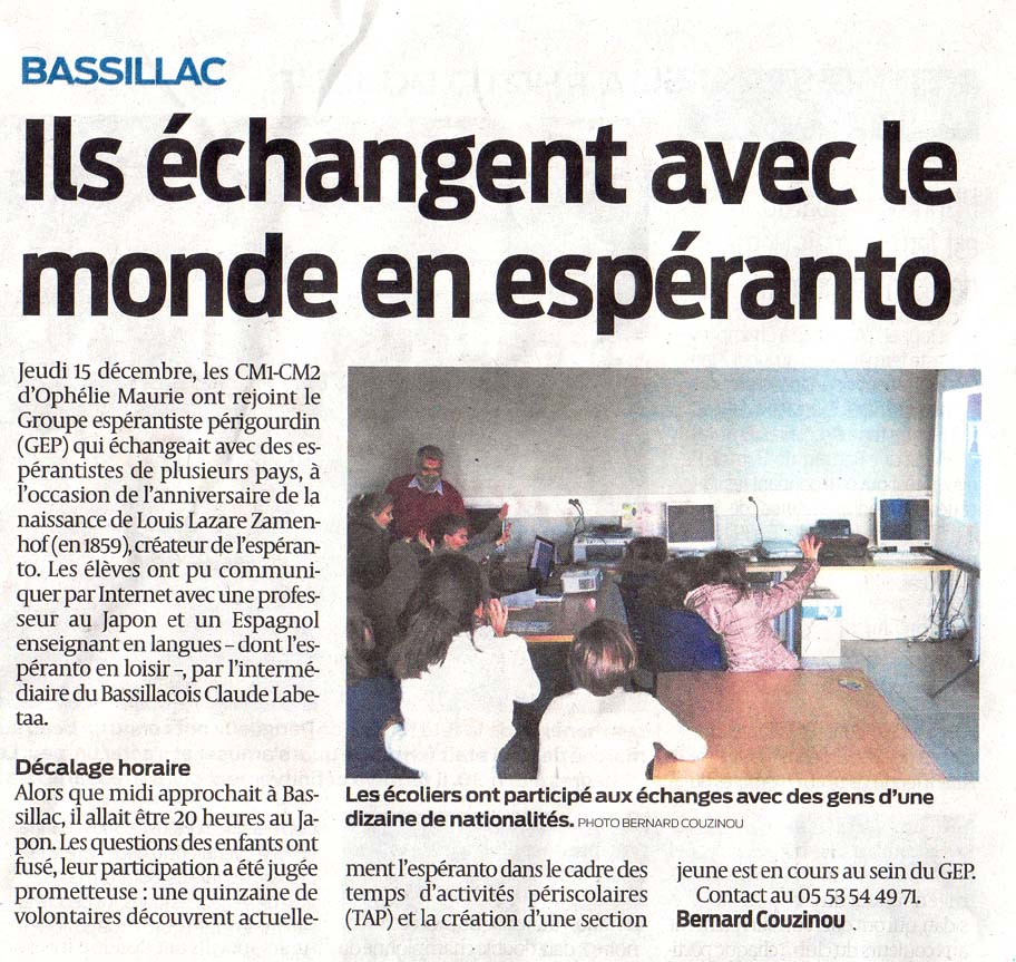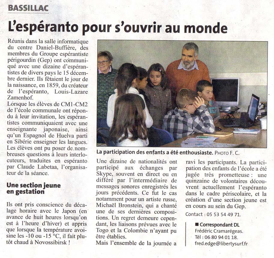 « Le jeudi 15 décembre les CM1-CM2 d’Ophélie Maurie ont rejoint le Groupe des Espérantistes Périgourdins (GEP), qui échangeait avec des espérantophones de plusieurs pays. Les élèves ont pu communiquer par Internet avec une professeur japonaise et un espagnol enseignant en langues. Les questions des enfants ont fusé et leur participation a été jugée prometteuse. Une quinzaine de volontaires découvrent actuellement l’espéranto dans le cadre des Temps d’Activité Périscolaire (TAP) » (d’après le journal local Dordogne libre) (Info : Cl. Labetaa).