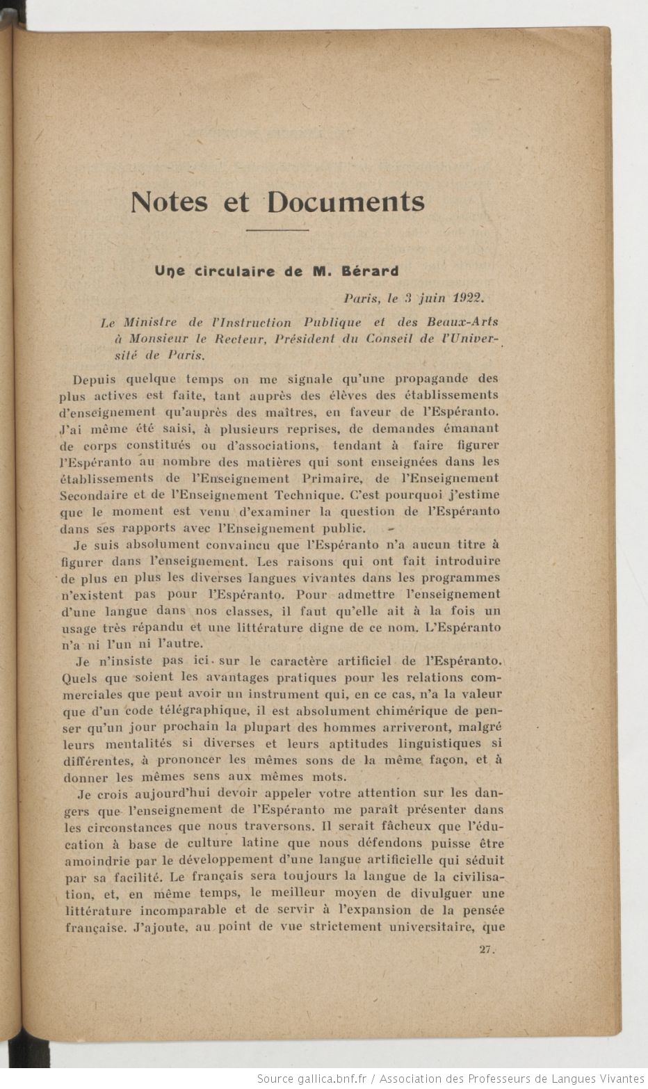 Depuis quelque temps on me signale qu’une propagande des plus actives est faite, tant auprès des élèves des établissements d’enseignement qu’auprès des maîtres, en faveur de l’Espéranto. J’ai même été saisi, à plusieurs reprises, de demandes émanant de corps constitués ou d’Associations, tendant à faire figurer l’Espéranto au nombre des matières qui sont enseignées dans les établissements de l’Enseignement Primaire, de l’Enseignement Secondaire et de l’Enseignement Technique. C’est pourquoi j’estime que le moment est venu d’examiner la question de l’Espéranto dans ses rapports avec l’enseignement public.