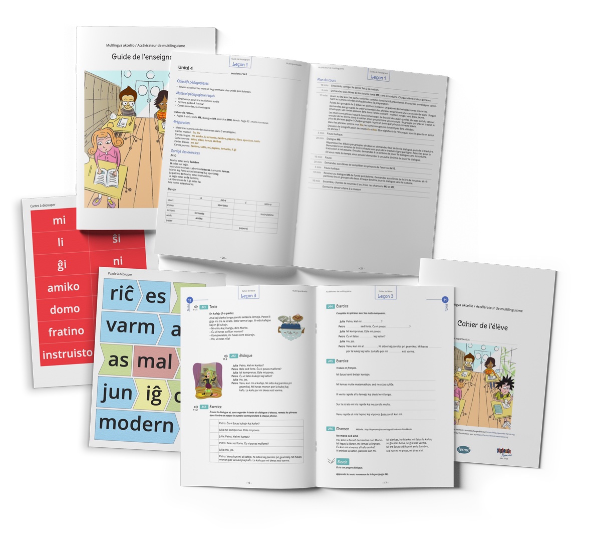 le Multlingva Akcelilo (accélérateur de multilinguisme) est un plan de cours créé pour servir d’introduction à l’apprentissage des langues étrangères et pour en accélérer l’apprentissage. Destiné aux enfants de 8 à 10 ans, pour un apprentissage en groupe : https://mla.esperanto-france.org/ - Metodo 11, manuel destiné aux débutants pour une utilisation en groupe, mais pouvant aussi convenir aux autodidactes, avec des enregistrements audio et un corrigé type. Téléchargez gratuitement le premier chapitre sur https://metodo11.esperanto-france.org/ et dans la boutique : https://butiko-esperanto-france.org/methodes-et-manuels/22-metodo-11.html